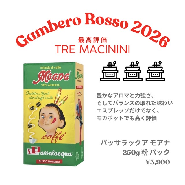パッサラックアのブレンドのひとつ、「Moana(モアナ)」が、イタリアの権威ある評価機関 ガンベロ ロッソより最高評価の 「Tre Macinini」 を受賞しました。 「Moana(モアナ)」は豊かなアロマと力強さ、そしてバランスの取れた味わいが特徴です。 エスプレッソだけでなく、モカポットでも高く評価されています。 ナポリの有名バール「MEXICO」では、エスプレッソは「Moana(モアナ)」が使用されています。 ナポリのコーヒー文化の発展になくてはならない存在のパッサラックア社。 80年近く日々の一杯に真剣に向き合ってきた姿勢が、いま改めて正式に認められた結果だと感じます。 ナポリのコーヒーは、流行ではなく「積み重ね」 この受賞は、その価値を静かに、でも確かに伝えてくれるニュースです。 賞味期限 : 2026年6月30日